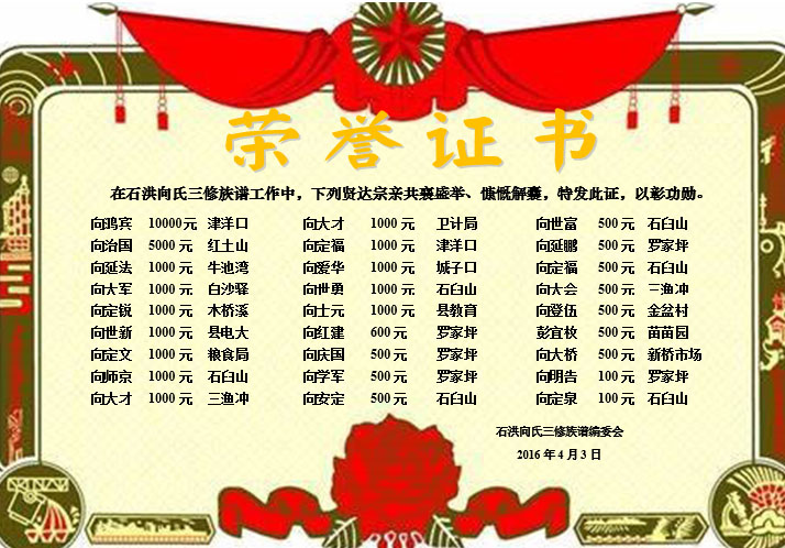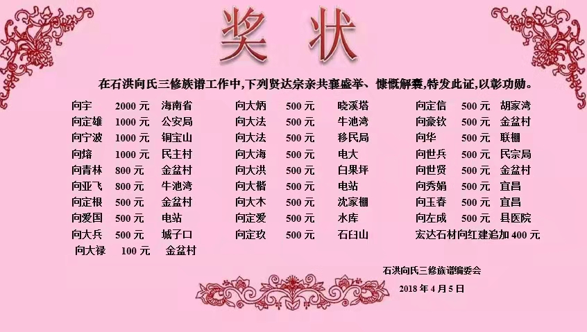 石洪向氏于2015年正式启动族谱三修,在此期间,受到以下贤达宗亲鼎力相助乐捐,特刊印于三修族谱之中,流芳后世!