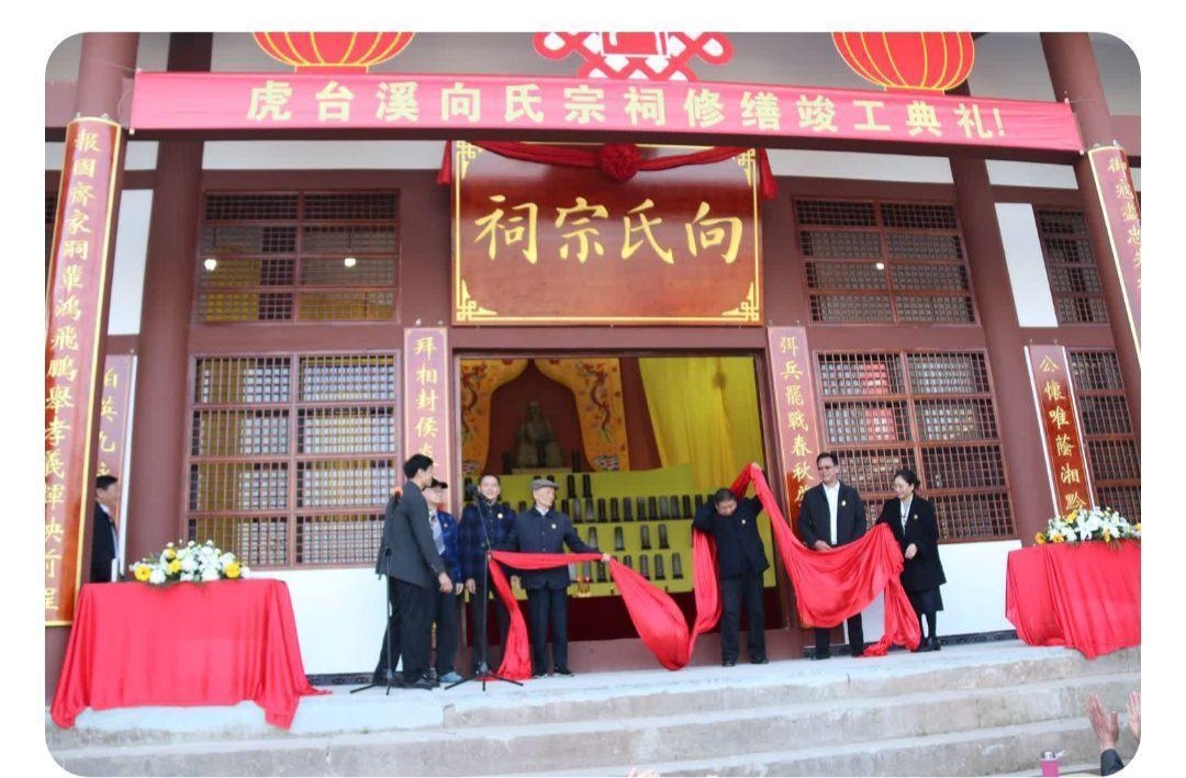 全国向氏宗亲总会长向兴中、重庆向氏宗亲会长向银彦、总会顾向家海、向哲慎和九君代表向勉为虎台溪向氏祠堂落成剪彩。绸缎剪开,鎏金大字“向氏宗祠”熠熠生辉,全场响起热烈的掌声。