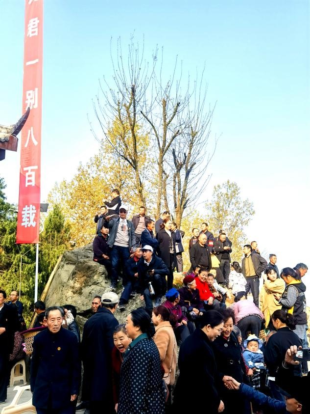 九君一别八百年。裔孙相聚话祖恩。现场座位不够,宗亲在祠堂前的大石头上参加典礼。