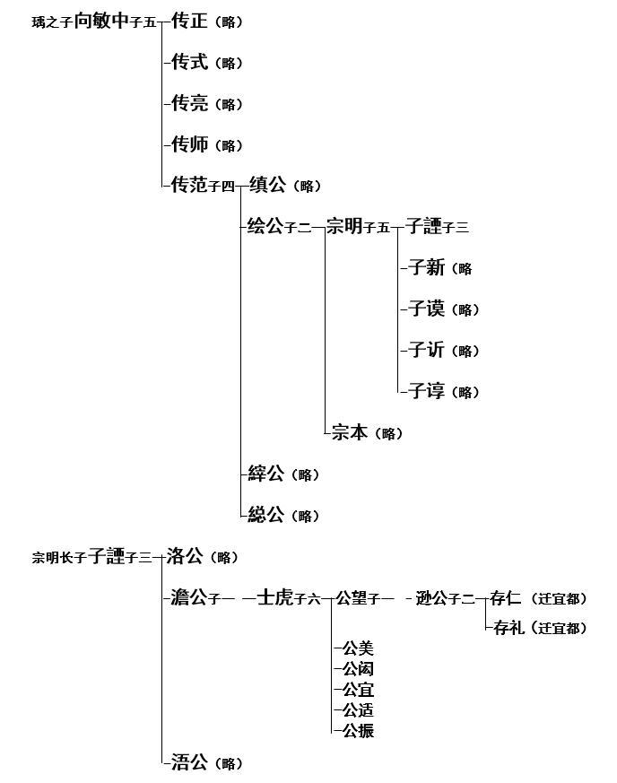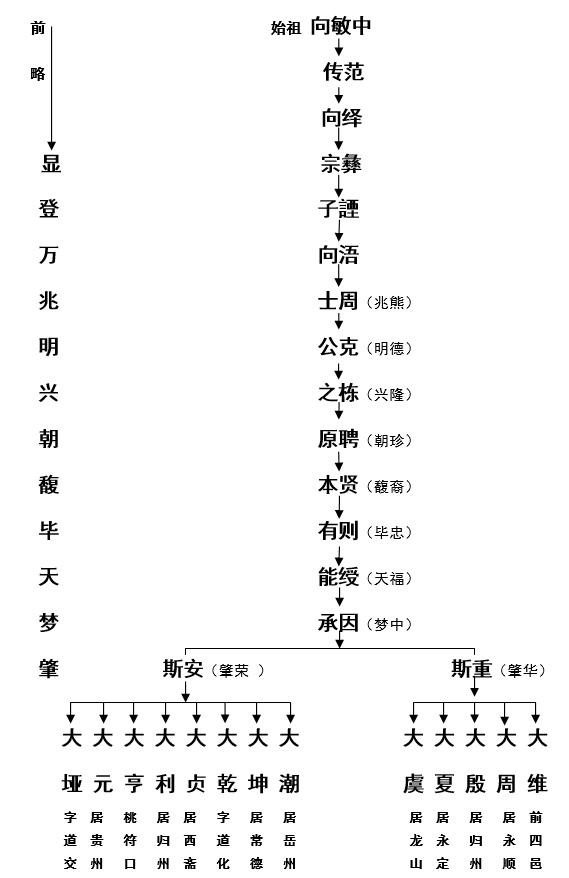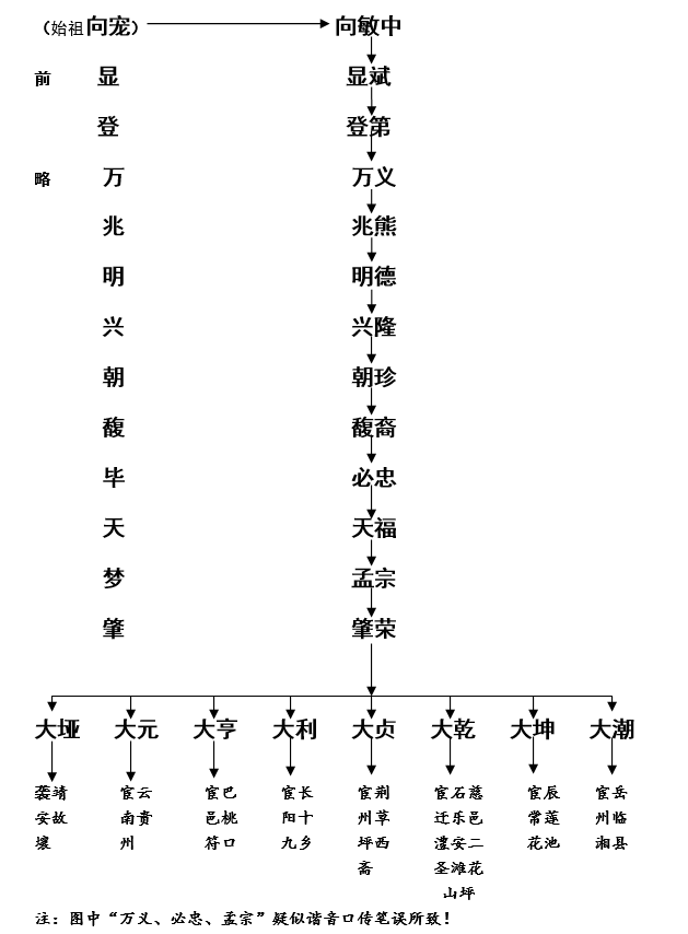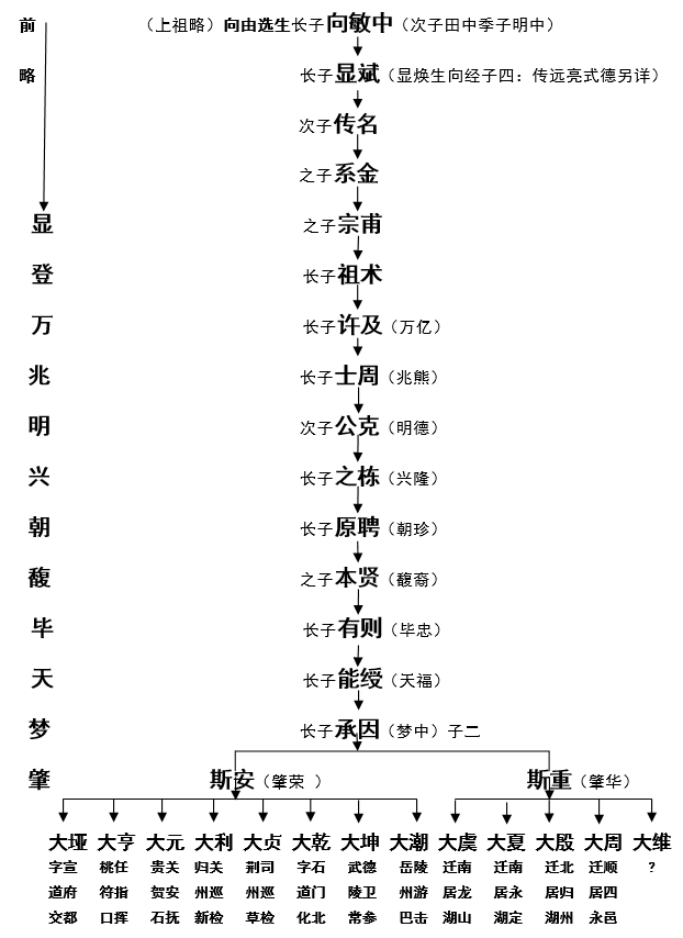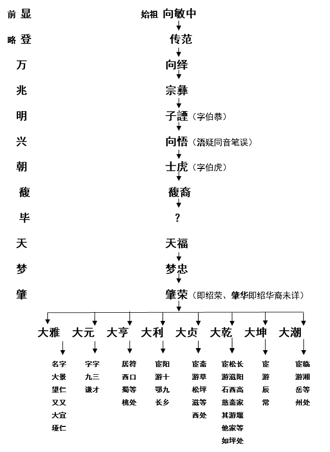 【根据民国37年湘鄂蜀联宗合修《向氏族谱》103卷之五“向氏历代世系总考”整理】