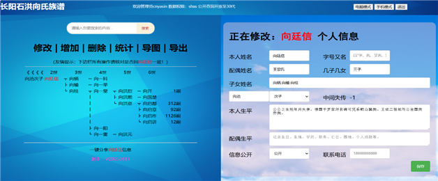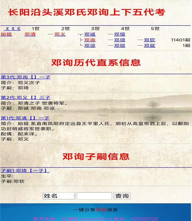 族谱采用数据库动态管理,查询到的直系或旁系族人信息,按五世一排,最后一列会智能计算后嗣人数,方便向前或向后点击查询,同时亦可在下方输入特定关键字查询。