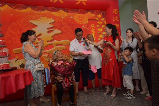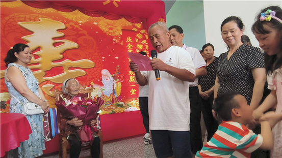 寿宴仪式上,向林聪会长致辞。他高度赞扬刘奶奶:“老人家年高德劭,是我族精神的楷模。她一生勤俭持家,相夫教子,抚育三男五女成人。如今儿孙个个成材,孝悌传家,福泽深厚。今日亲友欢聚,共庆百年喜寿!” 致辞情真意切,赢得共鸣。