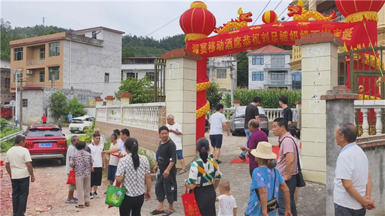 临近刘奶奶家,喜庆气氛已浓。门前道路张灯结彩数十米,一座喜庆龙门巍然矗立。门前宾客络绎不绝,人人笑容满面,手持红包礼品。主家热情相迎,备好烟酒零食待客,场面温馨热闹。